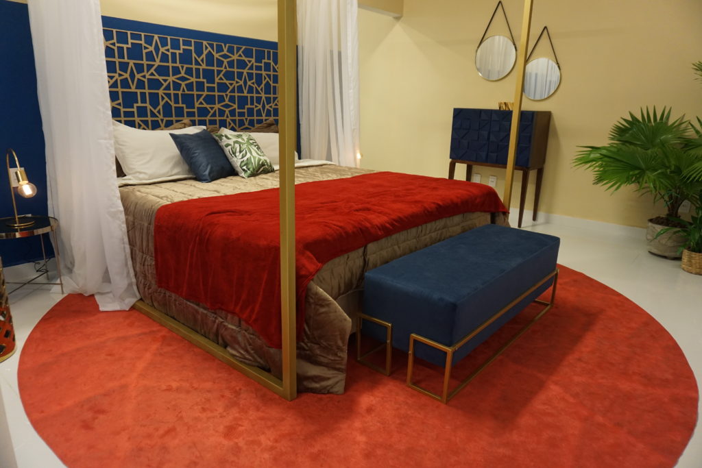 O tom escolhido para o quarto deixa o ambiente mais imponente, principalmente por ser de veludo, tecido clássico que torna o quarto mais luxuoso. Esse tom de azul é geralmente associado a aposentos da realeza, assim como pode ser encontrado em hotéis de luxo. Por isso acaba sendo bastante escolhido para quartos de casal.
